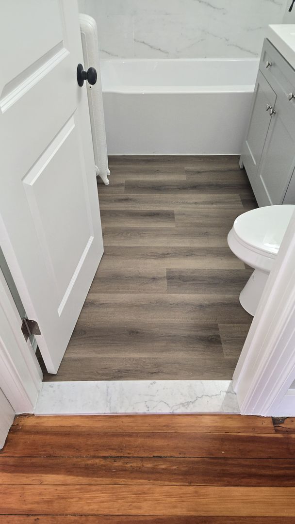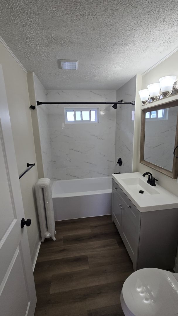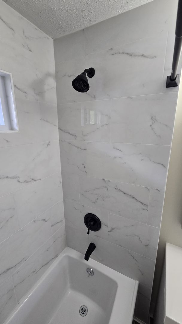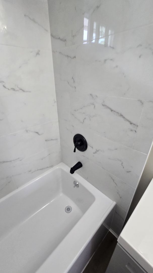 It features a luxury vinyl plank floor, a 30” quartz vanity, a brand-new acrylic tub with all-new shower walls, and matte black plumbing fixtures and hardware, including matching towel bars. It is rare to find this level of detail and finish in a rental property.