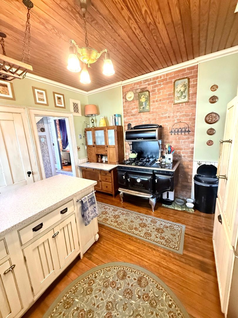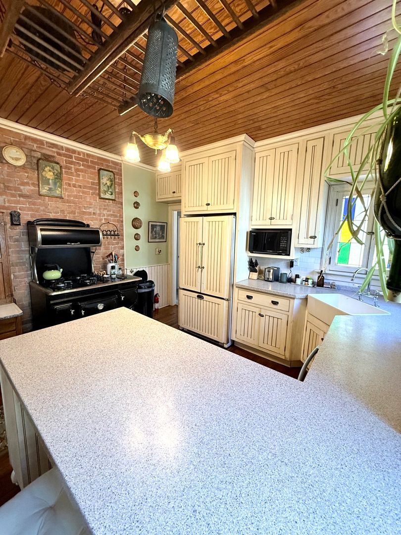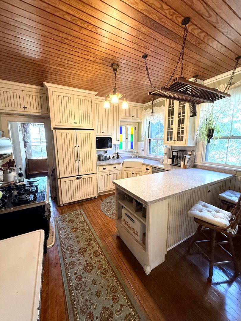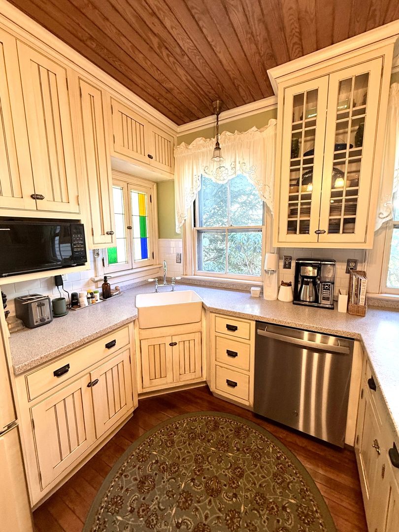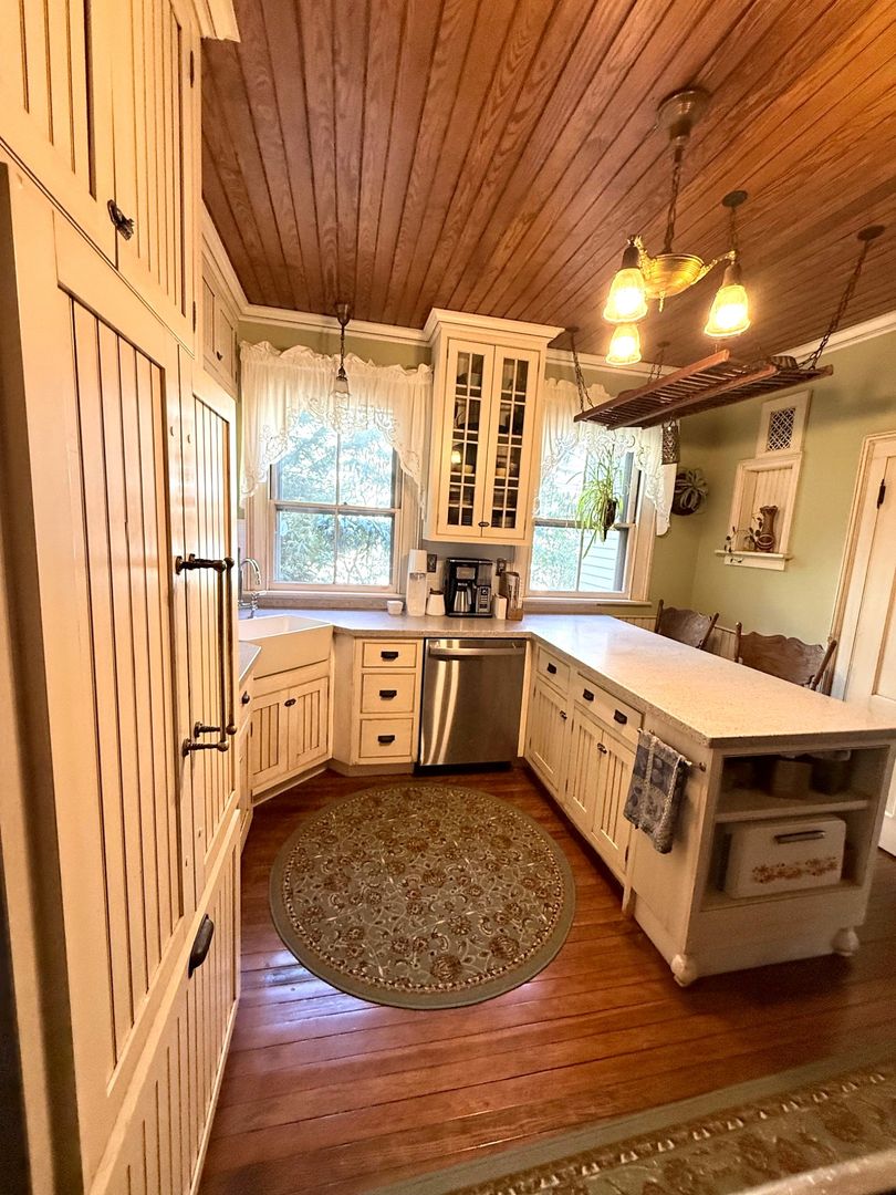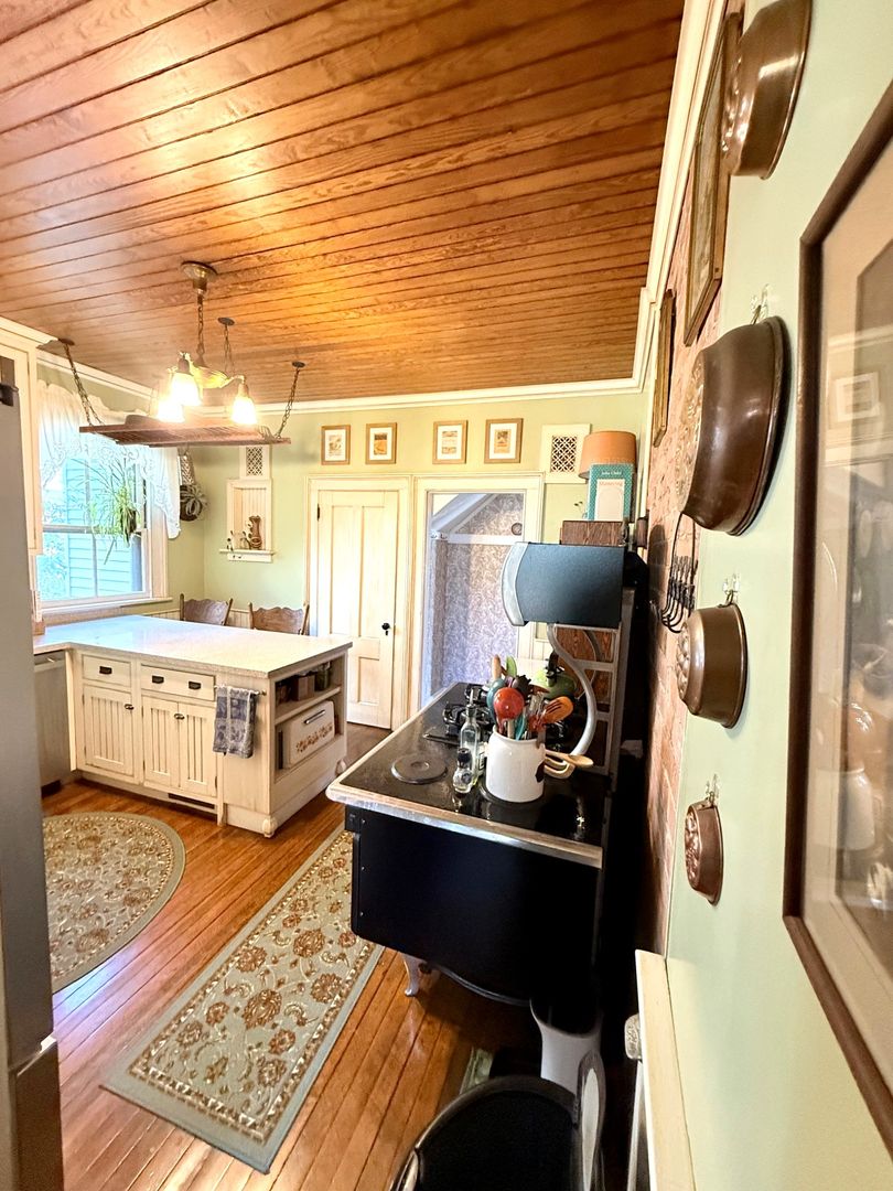 The updated kitchen is a standout with custom cabinetry, farmhouse sink, stainless steel appliances, center island, and a unique (made to look) vintage-style stove—perfect for anyone who loves to cook and entertain. There is also ample cabinet and counter space that you wouldn’t expect to see in a house this size.