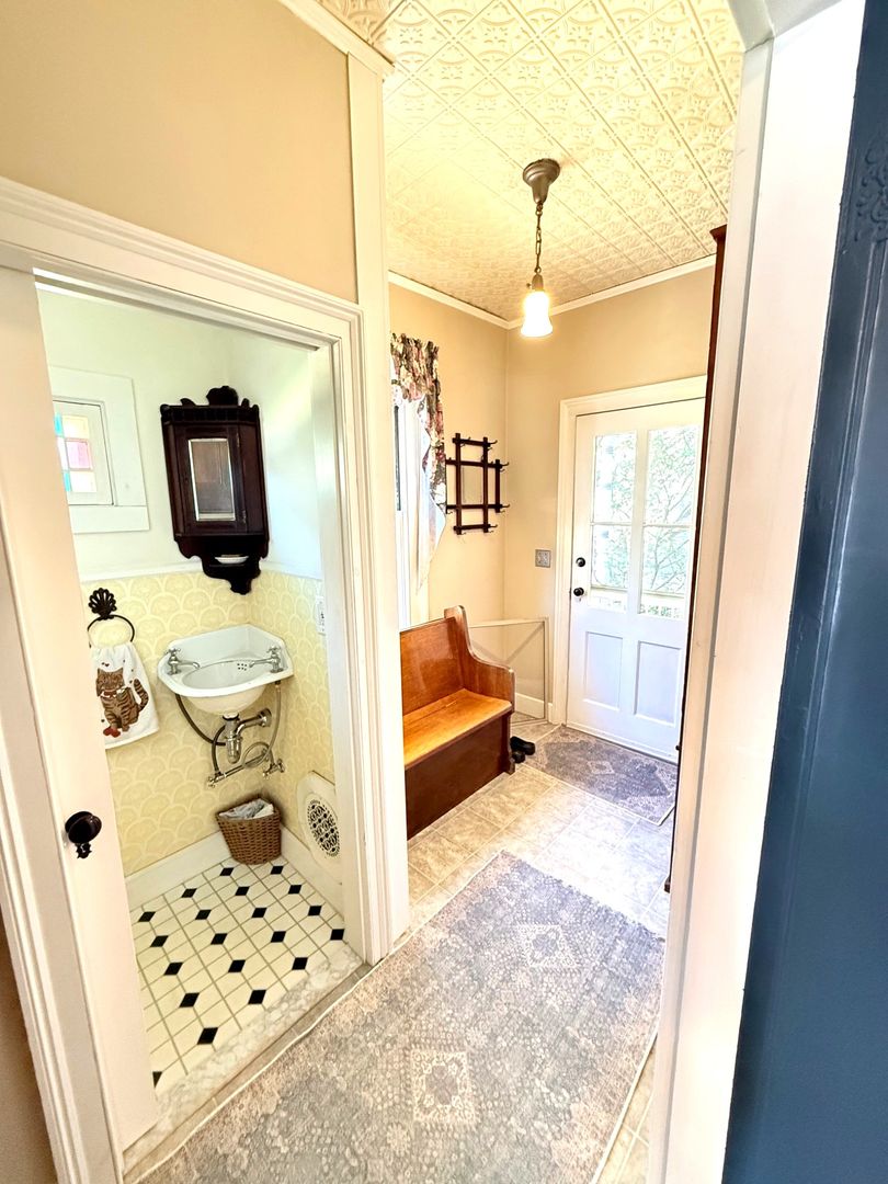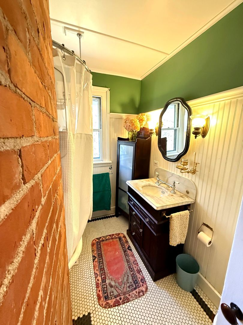 • Well cared for bathrooms with classic finishes and exposed brick chimney (Also, the kitty-corner sink in the half bath, how coo!)