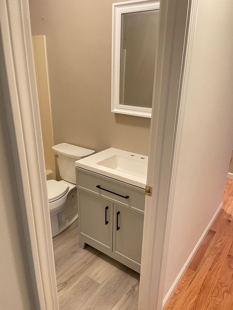 The bathroom has been updated with new marble vanity, light, mirror, floor, and toilet.