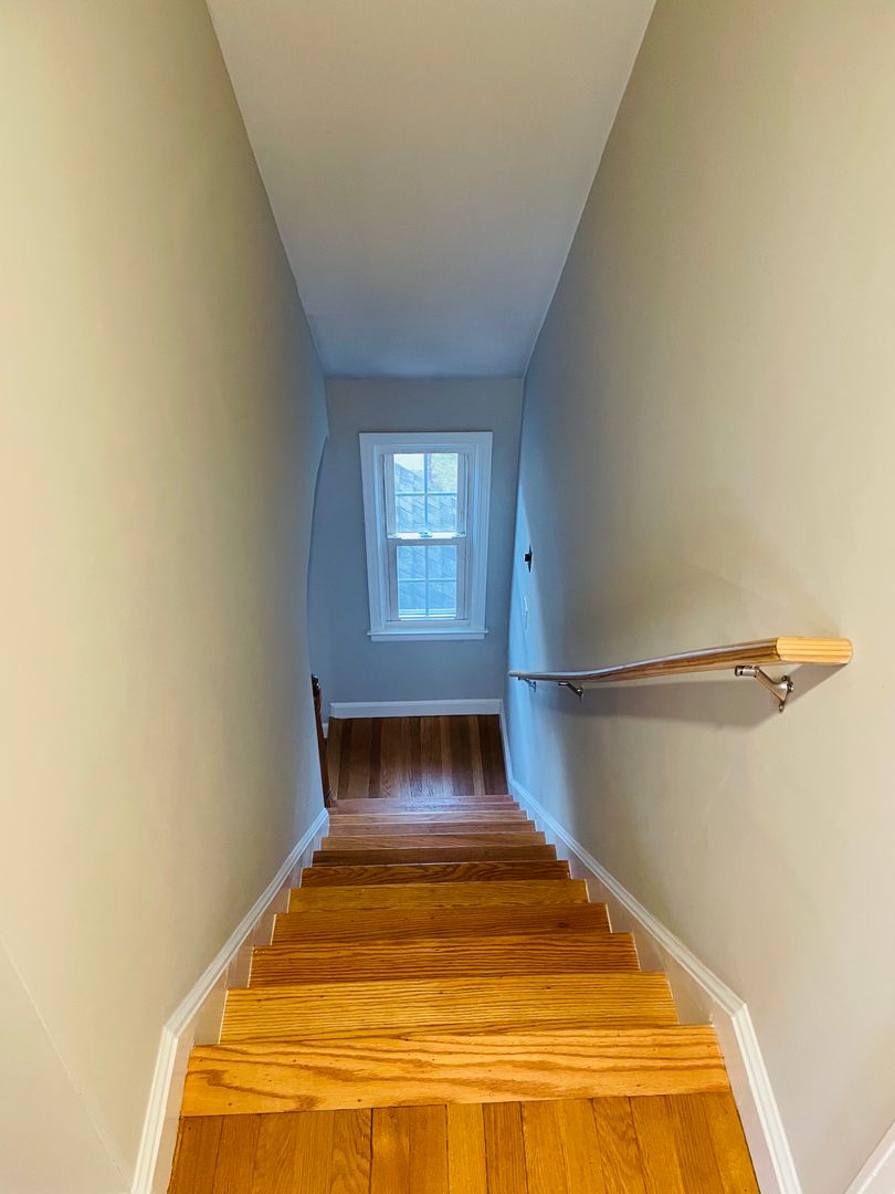 This apartment is on the second AND third floor of a two-family house. From the outside, it does not look like a typical multi-family house. If it wasn’t for the house numbers, the single front door looks just like a single-family colonial.